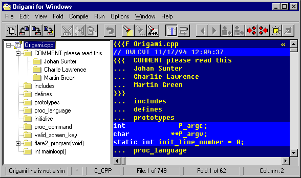 Origami is the folding editor. A 'folding editor' extends the principle of tree structured directories into a text file. This allows the simultaneous display of large amounts of text, by 'folding' sections of text away behind a descriptive heading. With suitable structuring of the text it should be possible in most circumstances to ensure that no display exceeds a single screen at any one time.
